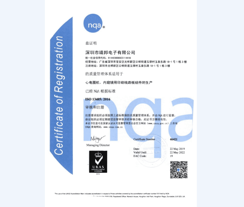 祝贺靖邦电子已获得国家医疗器械生产许可证,通过ISO 13485:2016出口医疗器械证书,中国强制性产品认证体系产品目录中的医疗器械强制认证证书; 我们是一家专业的医疗器械电子制造供应商!